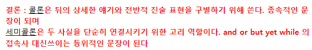 세미콜론은 두 사실을 단순히 연결시키기 위한 고리 역할이다. and or but yet while 의 접속사 대신 쓰이는 등위적인 문장이 된다