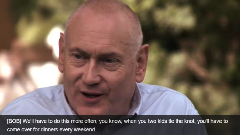[BOB] We'll have to do this more often, you know, when you two kids tie the knot, you'll have to come over for dinners every weekend.